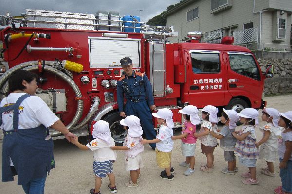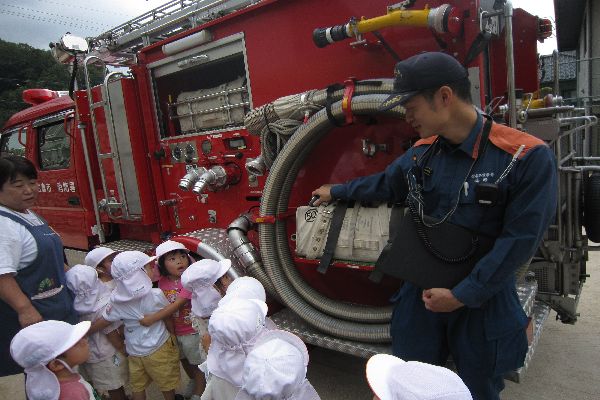 避難訓練をした後、消防士さんに