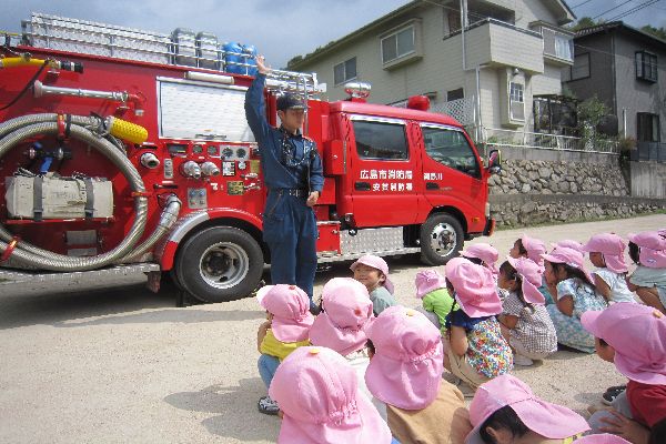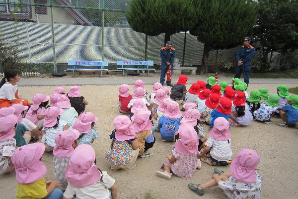 みんなの大好きな消防車も来園しました。避難訓練では上手に避難して、火事についてのお話を聞きました。実際に消火訓練も見ました。