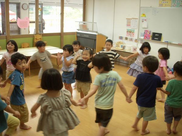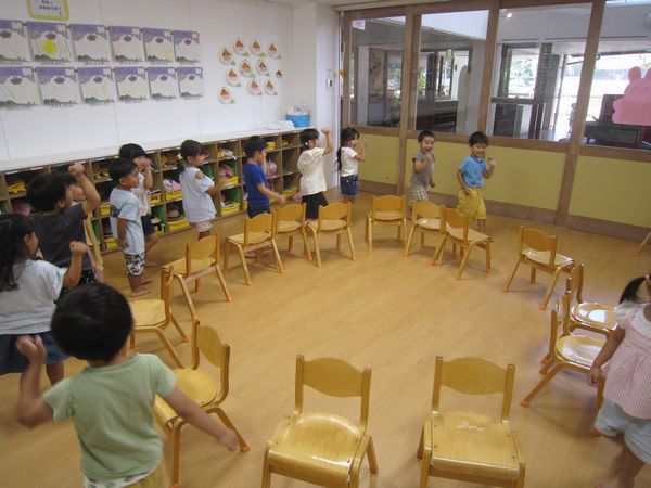 各クラスで椅子取りゲームをしました。音楽をよく聴いて、さっと椅子に座って、最後まで残れるよう頑張っていました。「あぶくたった」もみんなで楽しみました。