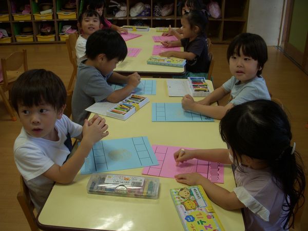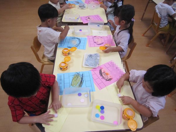 10月からお当番活動を始めるので、お当番表を作りました。自分の顔を描き、周りに色んな色の丸を貼って、素敵なお当番表ができました。「早くやりた~い!」とお当番をすることを楽しみにしているようです♪