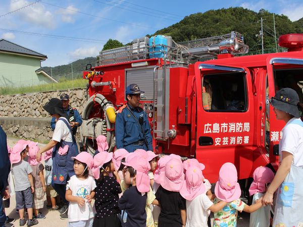 消防車来園の日には、消防署の方がお話をしてくださったり、消防車と救急車を近くで見ることができました。かっこよかったね!