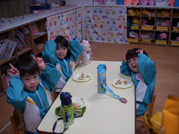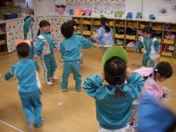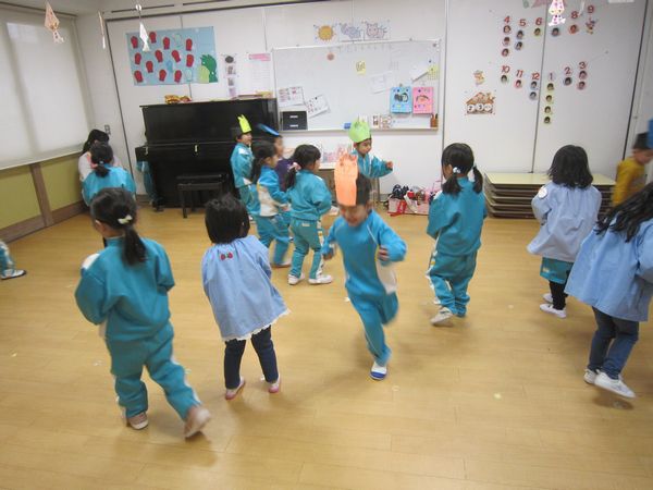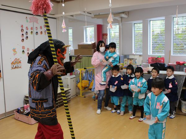 3日に豆まきをしました。自分の作ったお面を付けて、各クラスで豆を投げて楽しみました。豆の代わりに、お菓子をいただきました。その後…、本当の鬼がやってきました。怖がらずに豆を投げるお友達や、怖くて涙が出てしまったお友達もいましたが、みんなで鬼をやっつけて、強くなれました!