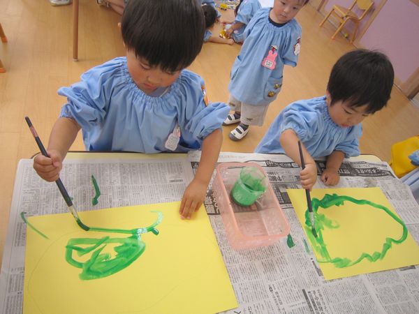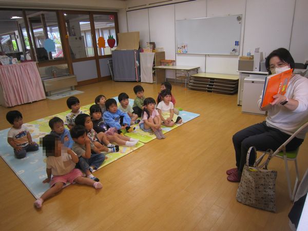 年少組になって初めてのお話し会がありました。4冊のお話を聞かせてくださいました。みんな、楽しそうに見ていました。