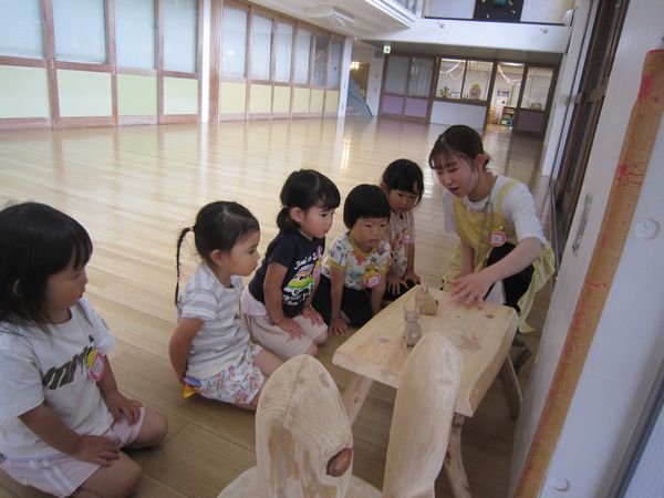間伐材でできており、匂いをかいだり実際に座ったりしました!