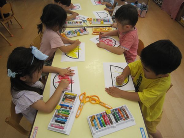 スイカは、クレパスで色を塗って、ハサミで切りました。赤か黄色、好きな方を選んで塗り、おいしそうなスイカができました。