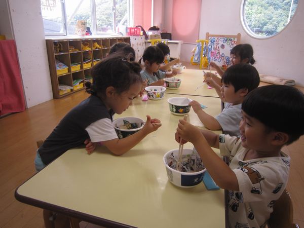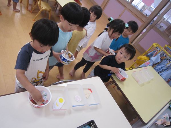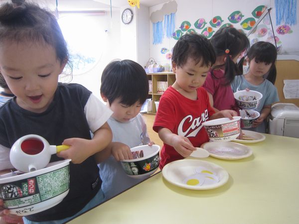 広告を細く切っておそばを作りました。はさみを「グーパーグーパー」と動かし、頑張って続けて切りました。先日持ってきていただいた、カップ麺の容器を使って、中に切ったおそばと、エビフライ・なると・ゆでたまごをトッピングして、おいしいおそばができました。自分で食べたり、おそば屋さんごっこをして楽しみました♪