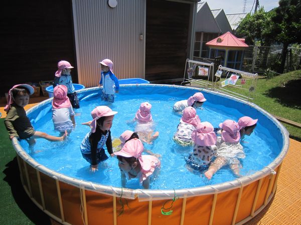 木曜日はお天気も良く、プールの水が冷たくてとても気持ち良かったです。ワニさんになってお散歩したり、宝探しをしたり、おもちゃで遊んだりと時間いっぱい楽しみました。