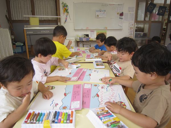 今回は、「おおなみこなみ」を描きました。海の中にたくさん波を描いて、「おさかなさん、喜んでるね!」と楽しんでいました。