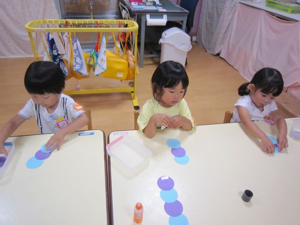 丸折り紙を繋げてまるつなぎを作りました。水色と紫を順番に貼りました。