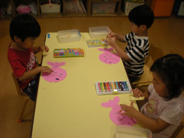 目やしっぽの筋、えらをクレパスで描いて、シールを貼り、かわいい魚ができました。