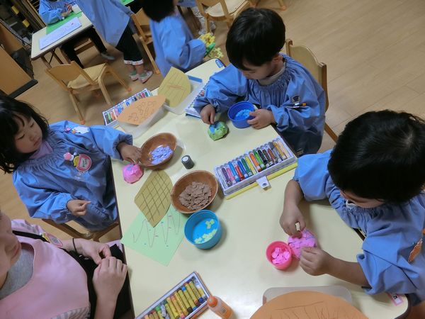 アイスクリームを作りました!「何味がいいかな?」と自分で選んだフレーバーにクレパスでソースを付けてトッピングも乗せました!