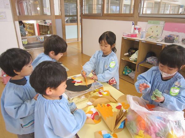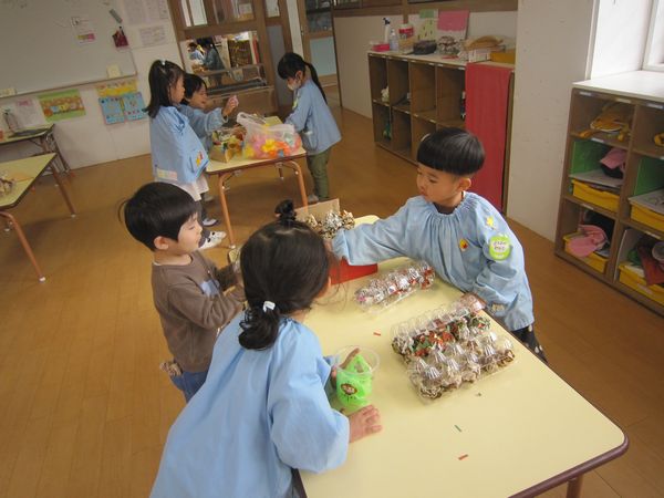 ☆クラスでお買い物ごっこを楽しみ、年少組で作ったたこやき・クレープ・ジュースを持ち帰りました。またお家でお話を聞いてみてくださいね♡