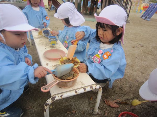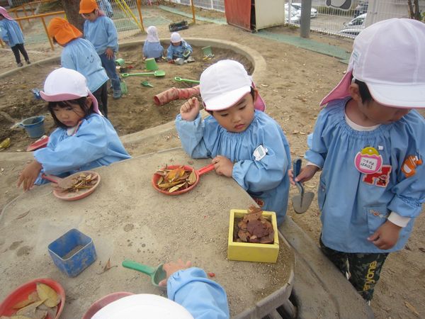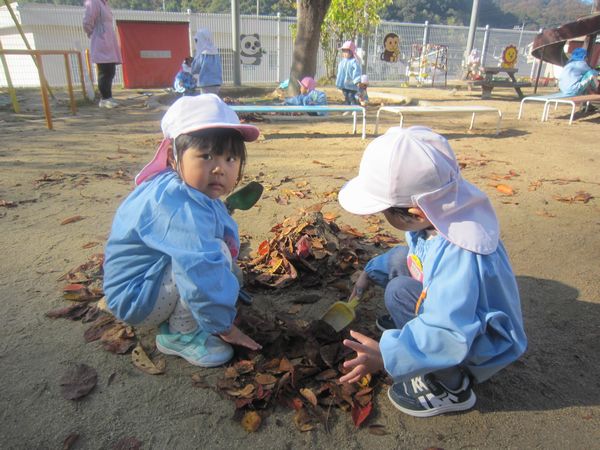 落ち葉を使っておままごとをしたり、落ち葉を風に飛ばしてみたり楽しいね!