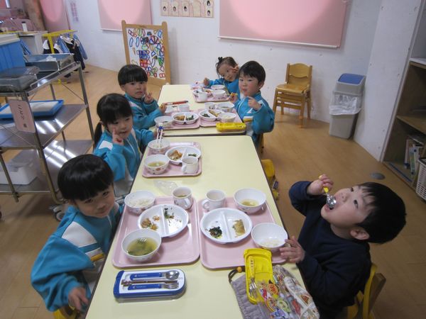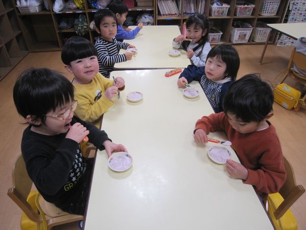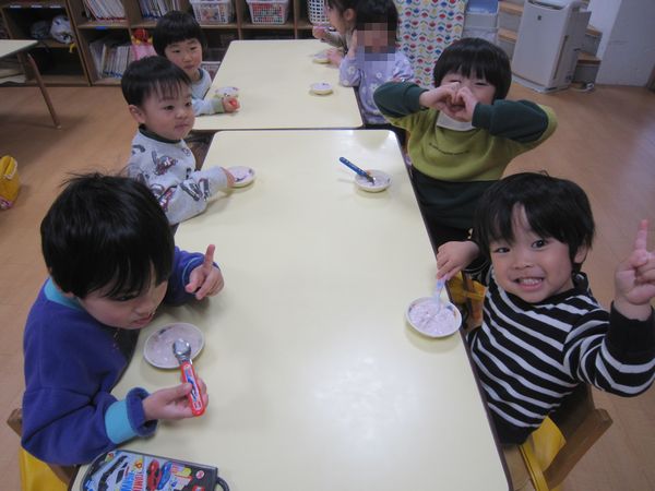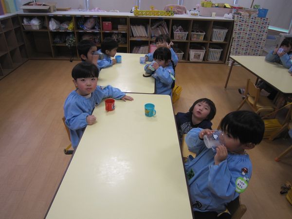 うれしいひなまつりの歌を歌って、カルピスを飲んで乾杯してお祝いしました♪