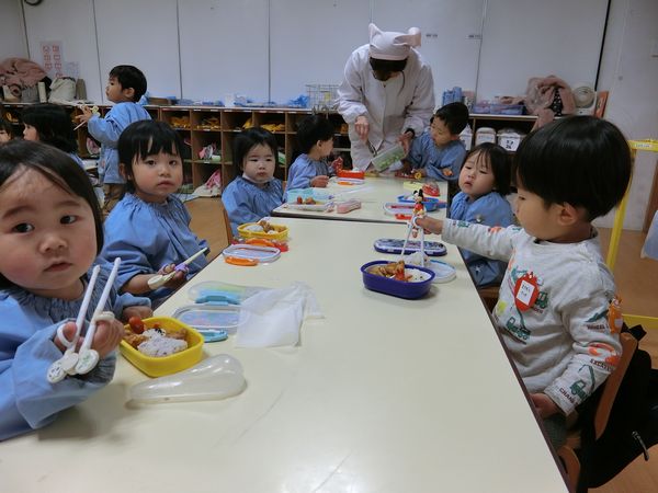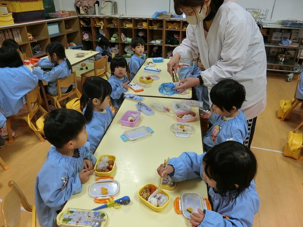 お弁当の蓋に食材を入れて、自分で具材を入れてお弁当を完成させました!