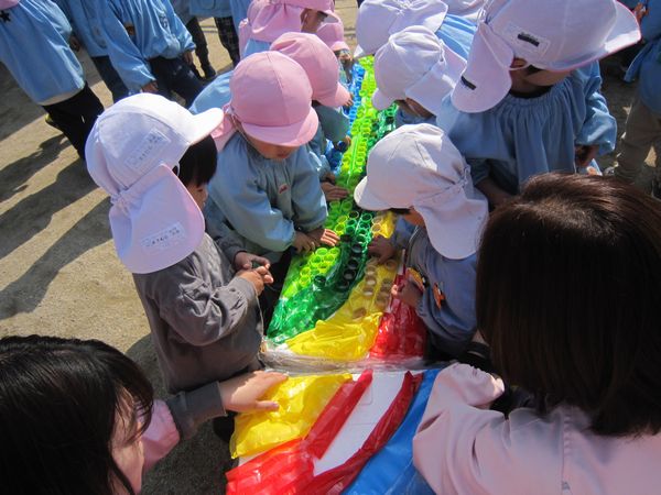 かかし祭りに向けて作り、園庭に飾ってあったペットボトルキャップアートはみんなでキャップを取りました!
