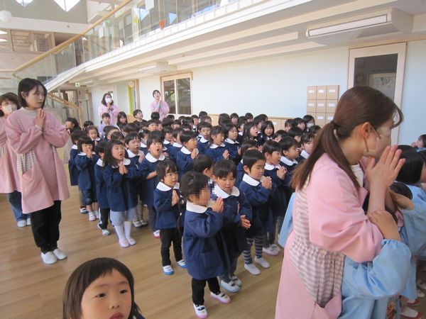 1年間、お友達とたくさん遊んだり、いろんなことを経験して、みんな大きくなりました。4月からは年中組さんです。また、元気に会えるのを楽しみにしています。