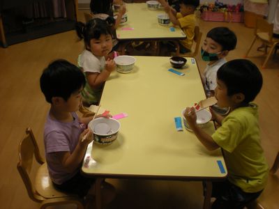 広告を細く切って、おそばを作りました。はさみの持ち方を伝え、難しいお友達もいましたが、一生懸命切っていました。カップ麺の容器を持ってきてもらい、「何をするの?」と楽しみにしていた子ども達。その容器に切ったおそばを入れ、なると・えびフライ・ゆで卵をトッピングし、おいしいおそばができました。出来上がったおそばを「おいし~い!」と言いながら食べていました。