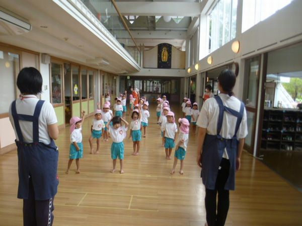 運動会の日がもし雨だったら、1階のホールで運動会をします。今日は、その場合の練習をしました。ホールでする時も、みんな大きな声で歌ったり、体操をしてがんばっていました!