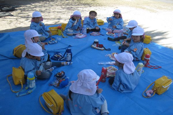 みんなで園庭でお弁当!おいしいね!
