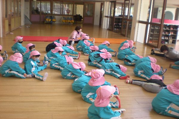 体操教室では、準備体操をした後、くま・うさぎ・わに・かに・あひる・かえるといろんな動物に変身してマットからマットまで移動しました。最後には「た~まごたまご」のゲームをして、とても楽しかったです!