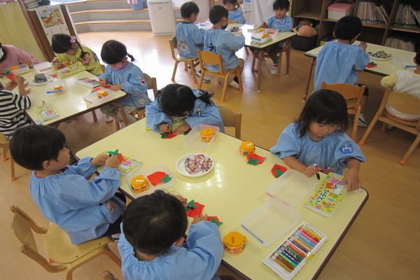 四角の形が段々とイチゴの形に変身していく姿に子ども達も「お~!」と、喜んでいました。