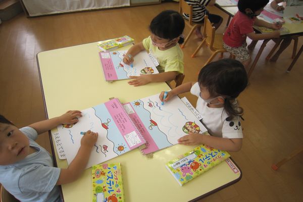 今日はクレヨンで、海に「ざぶ~んざぶ~ん」と、大きな波や小さな波を描きました☆