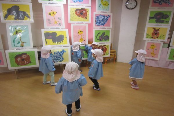 明日は作品展です。 お兄ちゃん、お姉ちゃんの作品を見せてもらいました。 「わ~!!すごいね~!」目をキラキラさせて見ていました。 来年はみんなの作品も展示してみてもらおうね♪