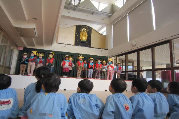 明日は年少組さんのお遊戯会です。 頑張って練習している様子を見せてもらいました。 来年はみんなもあの舞台に立ってるんだね! みんな上手だったね!楽しそうだったね♪