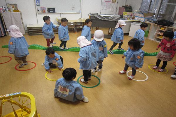 橋を渡った後は島を跳び越えるよ!両足を揃えて ピョンピョン!みんな上手にとべたね!