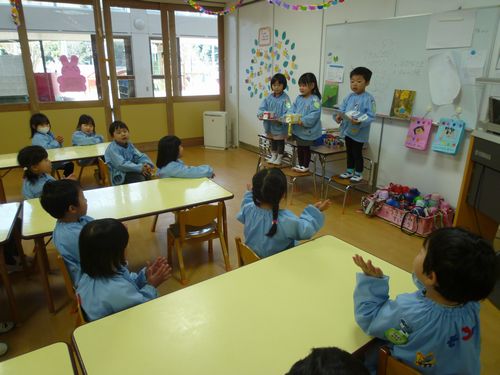 3月に生まれたお友達の誕生会がありました。クラスのお友達に言葉のプレゼントをしてもらって、うれしそうでした。お祝いをした後、各クラスで楽しいゲームをして楽しみました。よかったね!