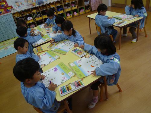 年少組最後のクレヨン遊びをしました。かわいいお花を描いて、お部屋がいっぺんに春になりました。たのしかったね!