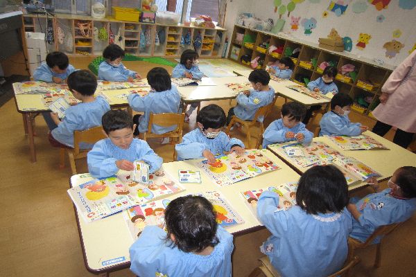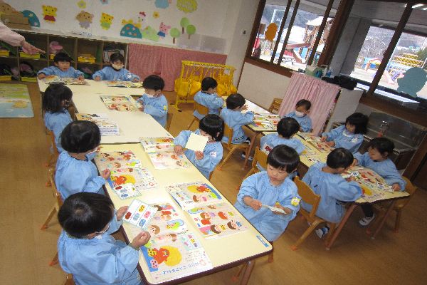 ひよこぐみさんの大好きな歌『鬼のパンツ』のシール貼りのページがあり、