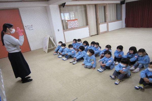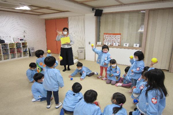 1人ずつボールを持って、同じ色のお友だちと歌に合わせて体を動かしたり、ボールを色の所に持って行ったりしました!