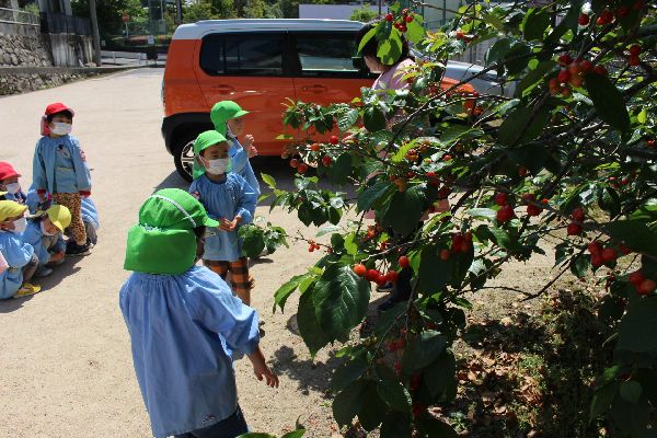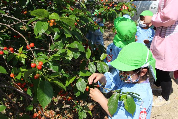 今日はさくらんぼが赤くなっていたのでみんなで収穫しに行きました