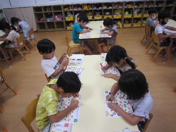 サツマイモの絵が描いてあったので、「みんなで植えたサツマイモおおきくなっているかな?」と言いながら描いている子もいました☆
