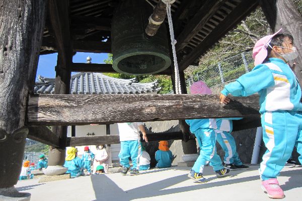 品秀寺では、大きな鐘や親鸞様に興味津々の子ども達。いろいろな所を探検して遊びました。
