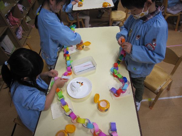 今日はみんなずっと友達だよという気持ちを込めてみんなで 協力して天井飾りの長い輪つなぎを作りました♪ 完成した時「すごーい!!長すぎる~!!宇宙まで行きそう」 と大興奮でした♪
