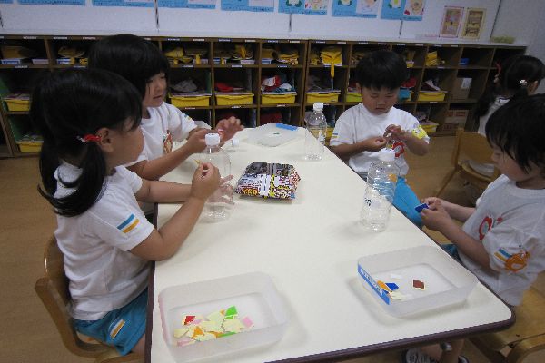 そして、水遊びに向けてペットボトルに模様を付けました!