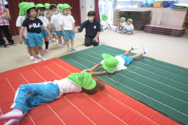 跳び箱を使ったり、うさぎさんでぴょんぴょんジャンプしながらたくさん前回りの練習をしました!最後は「おおかみがきた!!」というとマットの中に逃げるゲームもしてとっても楽しそうでした♪