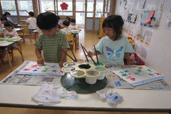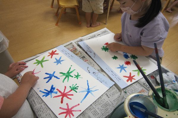 「梅雨が終わると夏が来るね!」「夏といえば…プール、アイス、せんぷうき…花火だね!!」と話をして、今日は2回目の水彩遊びで花火をかきました!