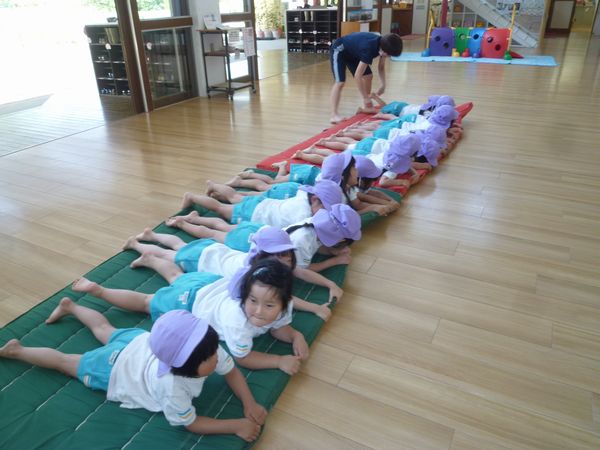 そのあとは、みんなでお芋になり、手に力をいれ、引き抜かれないようにするというゲームをしました!みんなしっかりマットを掴んで頑張っていました!