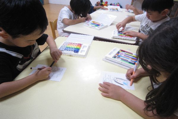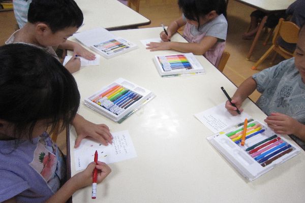 9月18日は敬老の日です。 大好きなおじいちゃんおばあちゃんのことを考えながら、はがきに絵を描きました☆