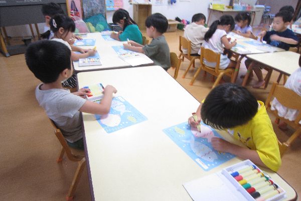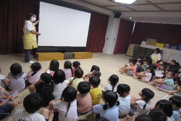 水曜日は誕生日会があり、大きなスクリーンで三匹のこびたのお話を見ました。面白いお話だったね!!8月9月生まれのお友達、お誕生日おめでとう☆★☆