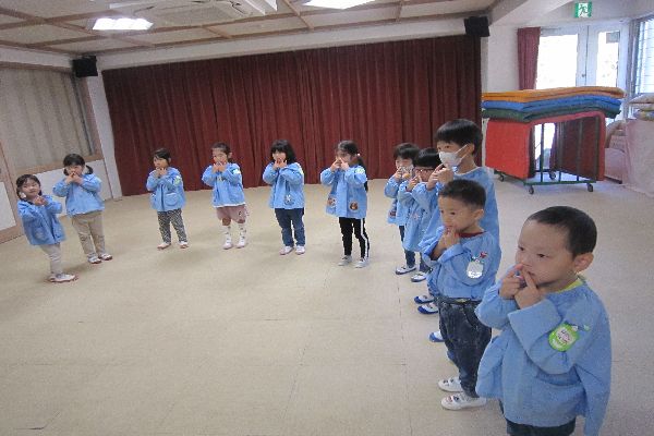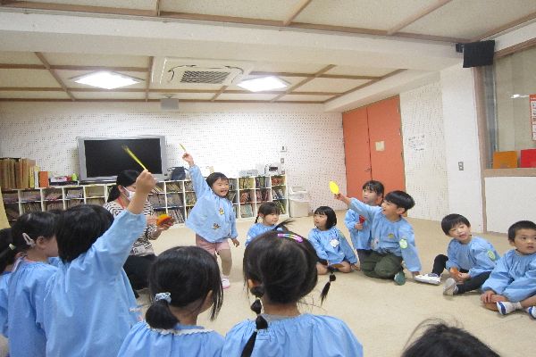 また、黄色、茶色、赤色の落ち葉を一人ずつ持って色に触れたり、「down」の合図で落としたりして楽しみました☆