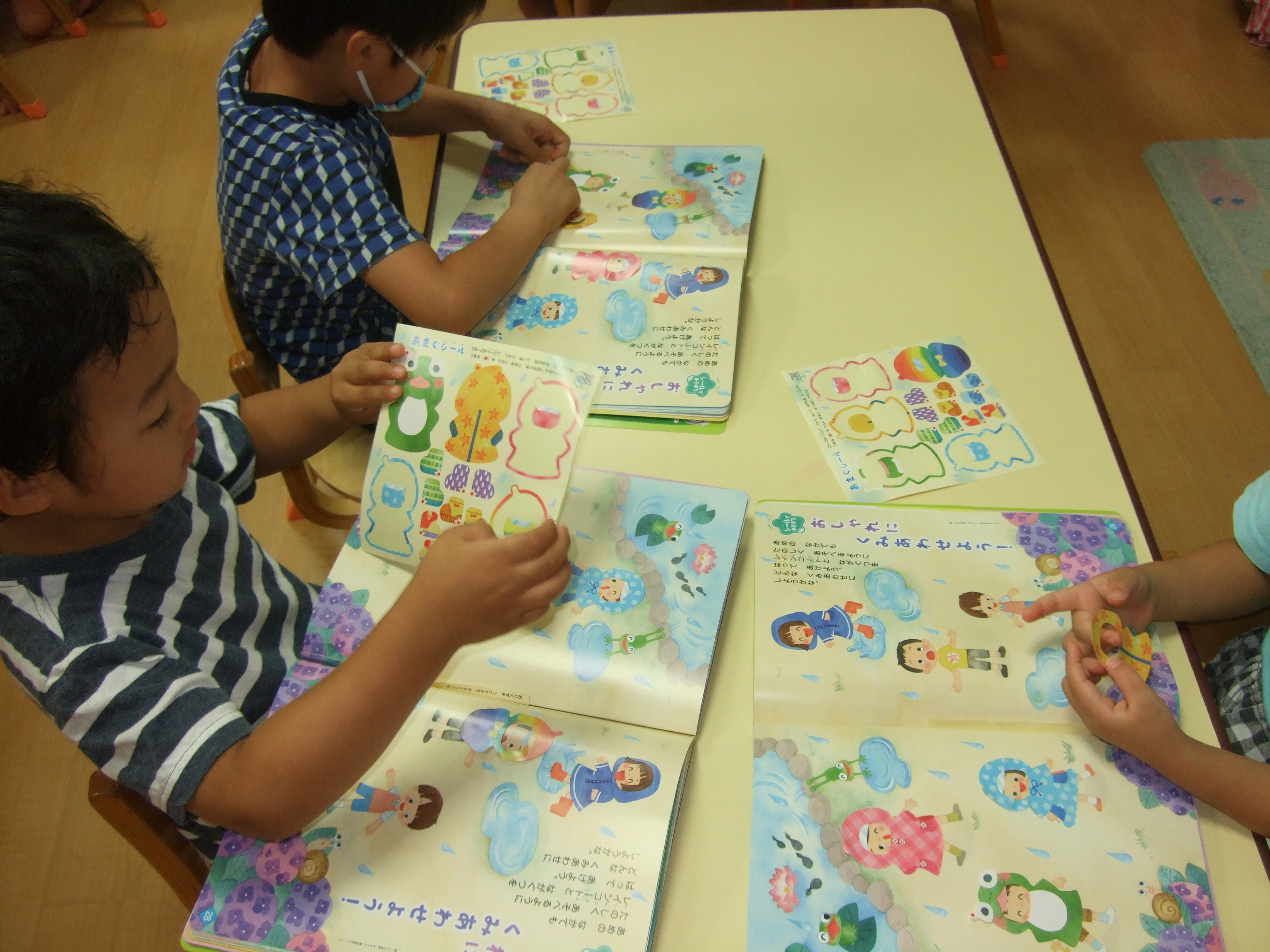 雨に濡れないようにレインコートを着せて長靴を履かせてあげました! 組み合わせも考えながら上手に貼れたね!