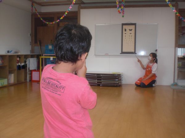 『指がどっちに向いているかを見てそれと同じ方向を指さしてね』という方法で視力検査をしました。 また、色覚検査もしました。