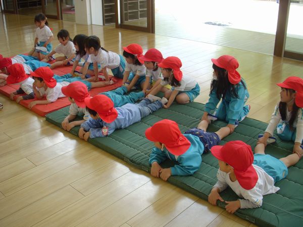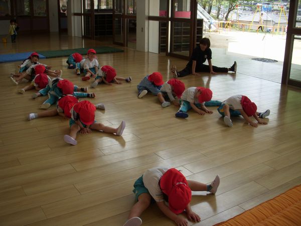 体操教室がありました!準備体操をして、マット運動をしました。前回りをしたりマットとマットの間をいろんな動きで移動をしたり、しっかり身体を動かすことができました☆彡