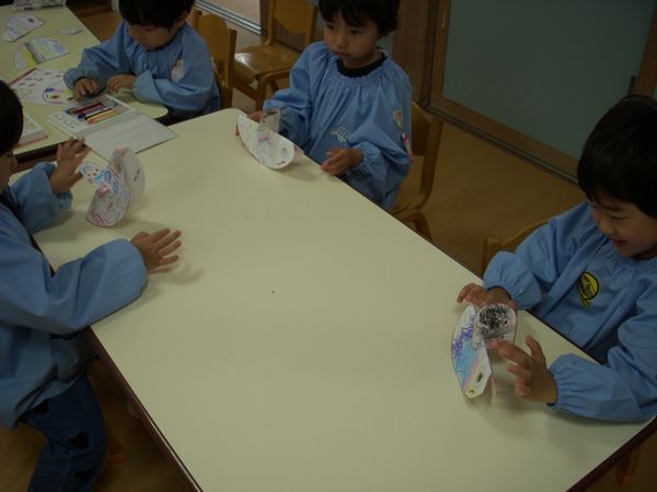 月刊絵本の付録も製作をして遊びました!手で動かすとゆらゆら揺れるこいのぼりです♪