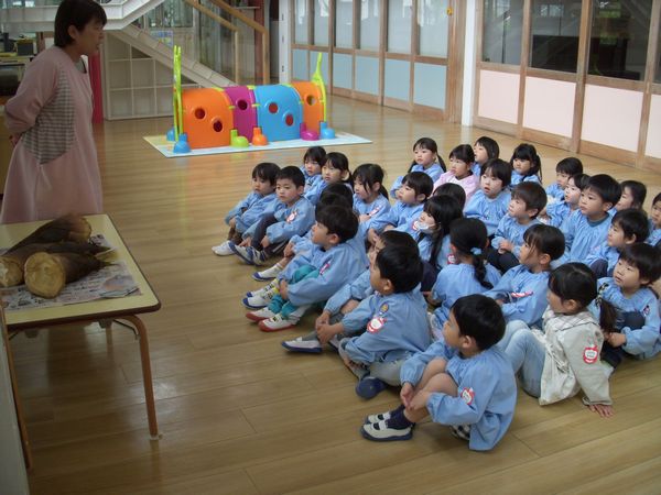 また畑賀の山でとれた、たけのこを近くで見ました!「かぐや姫のお話に登場したり、みんなが作った七夕飾りを飾る竹の赤ちゃんなんだよ!」とみんなで話をして楽しく観察することができました。